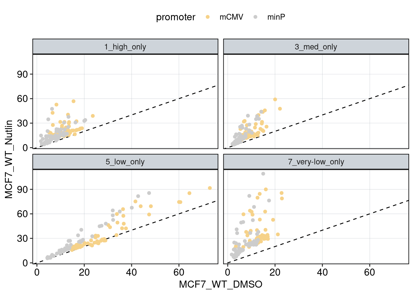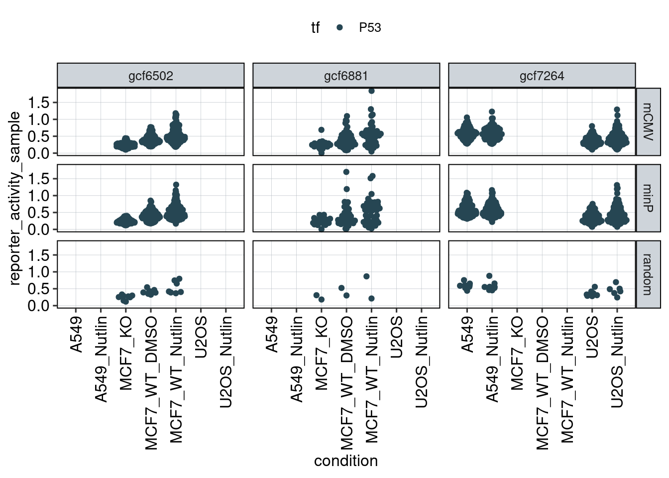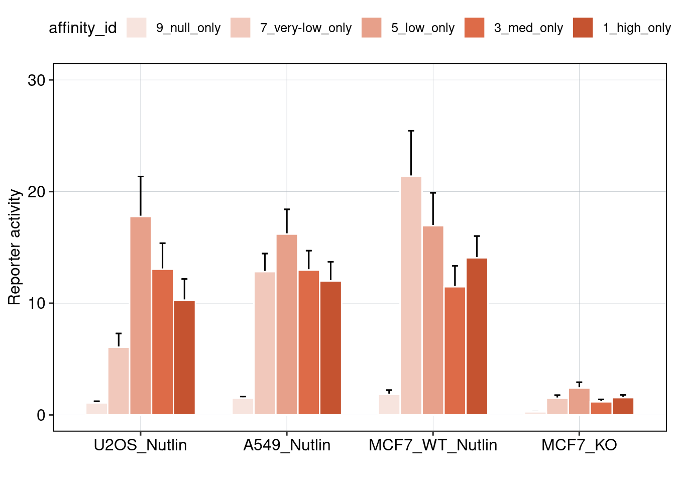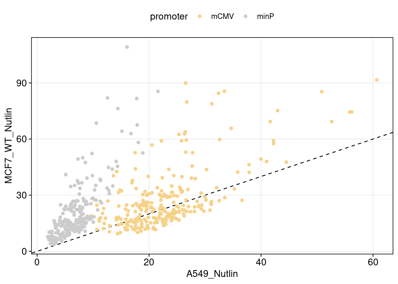 ~6,000 barcoded TP53 reporters were probed in MCF7 TP53WT/KO cells and stimulated with Nutlin-3a. I previously processed the raw sequencing data, quantified the pDNA data and normalized the cDNA data. In this script, a detailed dissection of the reporter activities will be carried out to understand how TP53 drives transcription and to identify the most sensitive TP53 reporters.