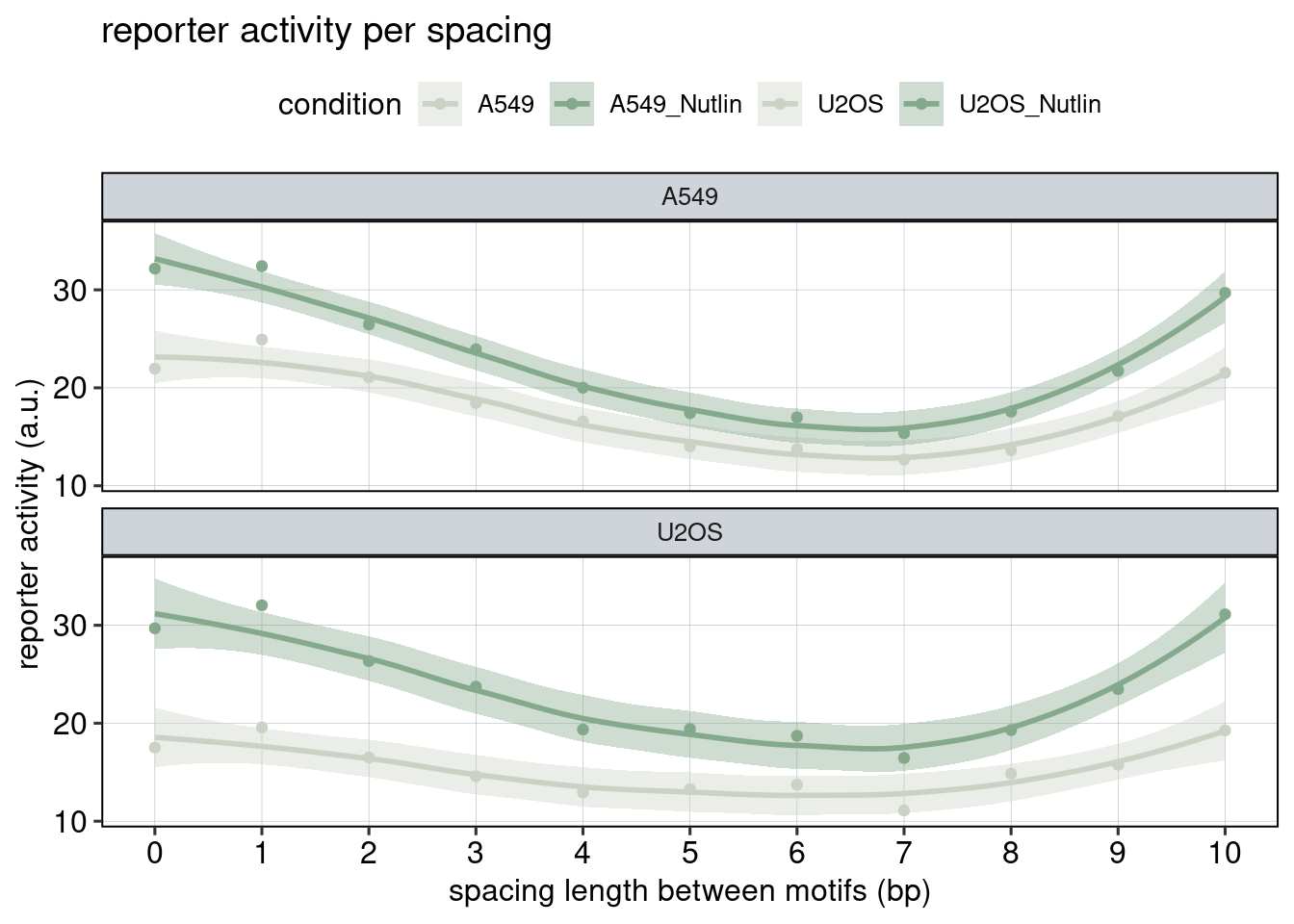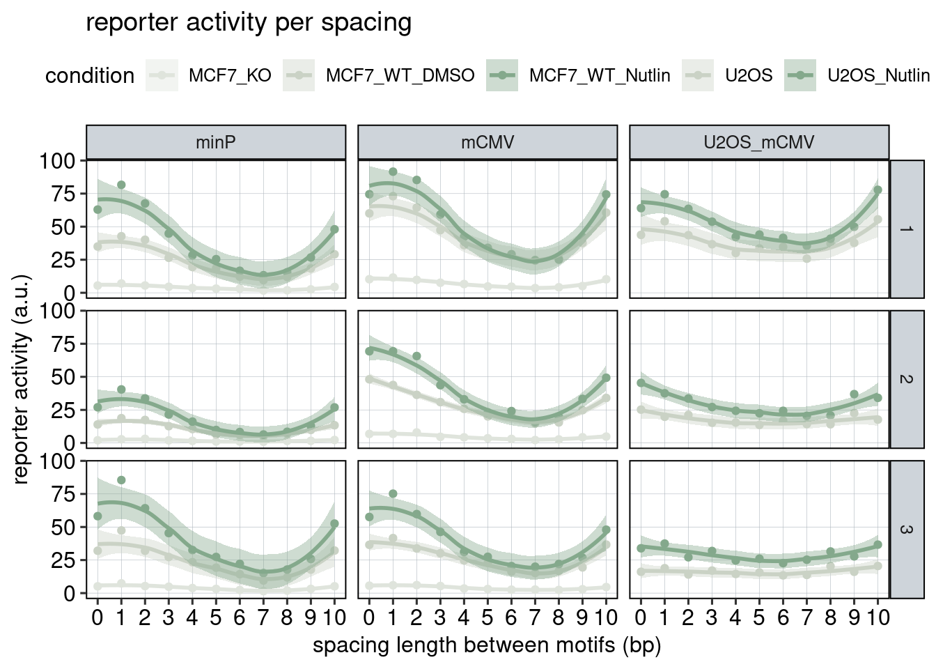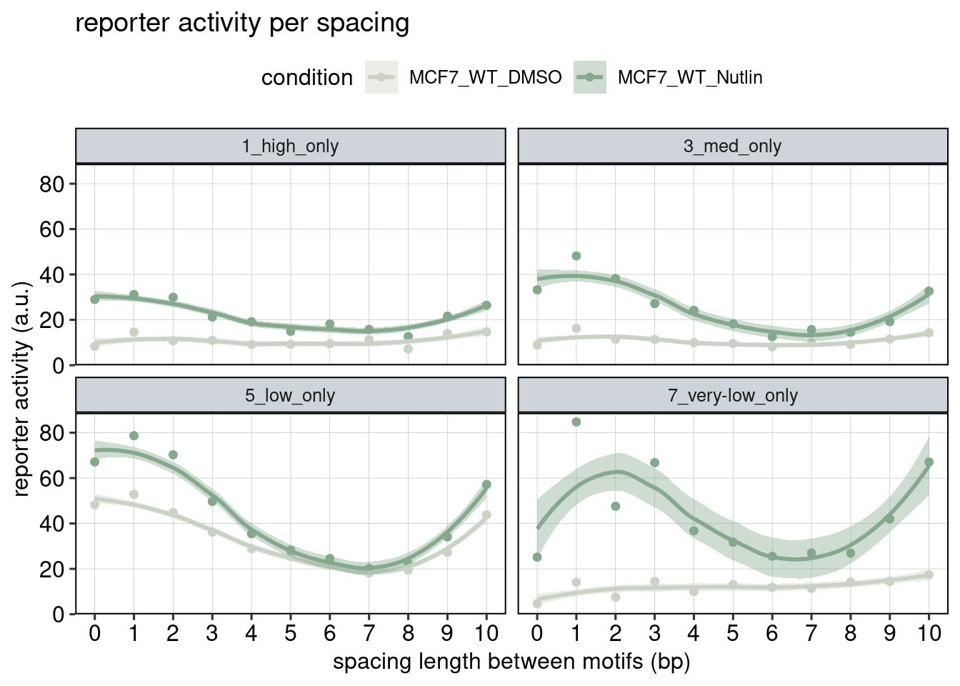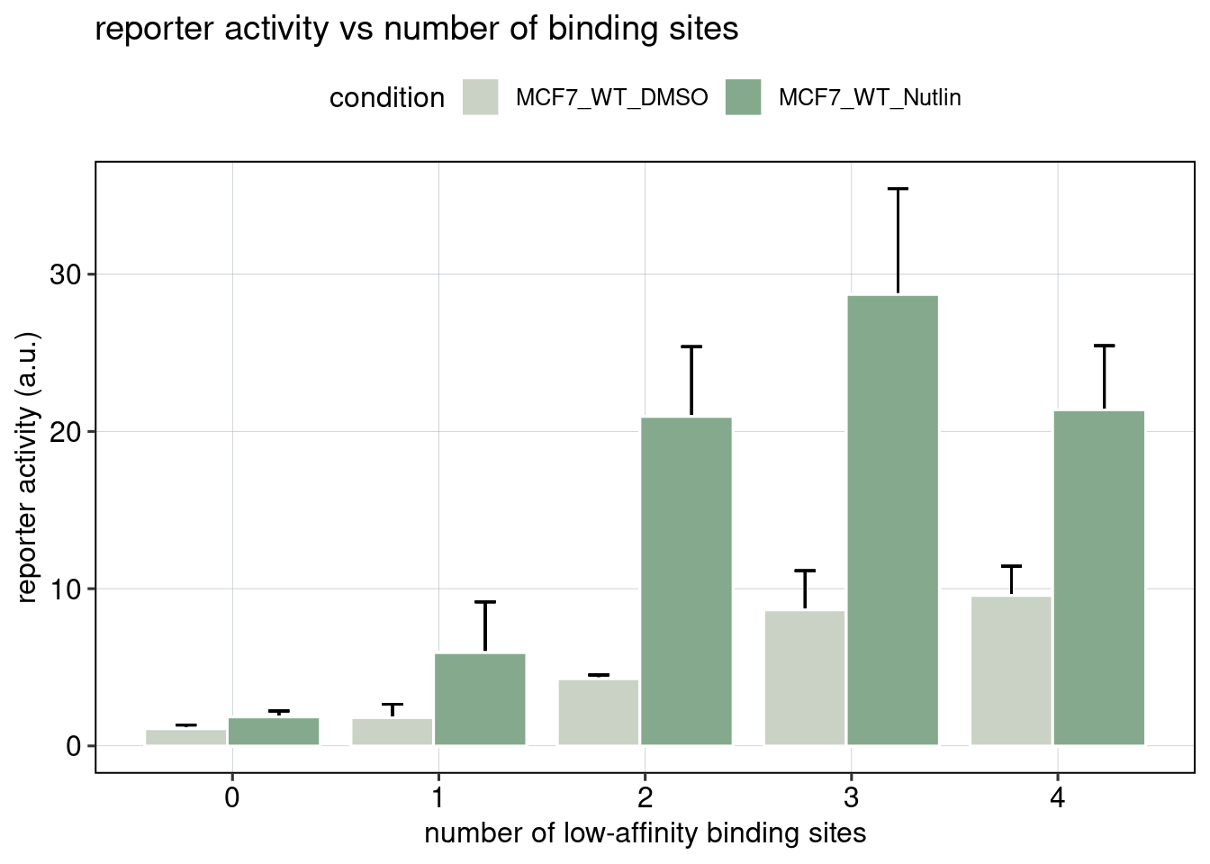 Conclusion: BS006 is the most responsive to Nutlin-3a. Addition of binding sites is super-additive. Positioning of binding sites matters - putting them directly next to each other is inhibitory, and putting them close to the TSS leads to higher activity.