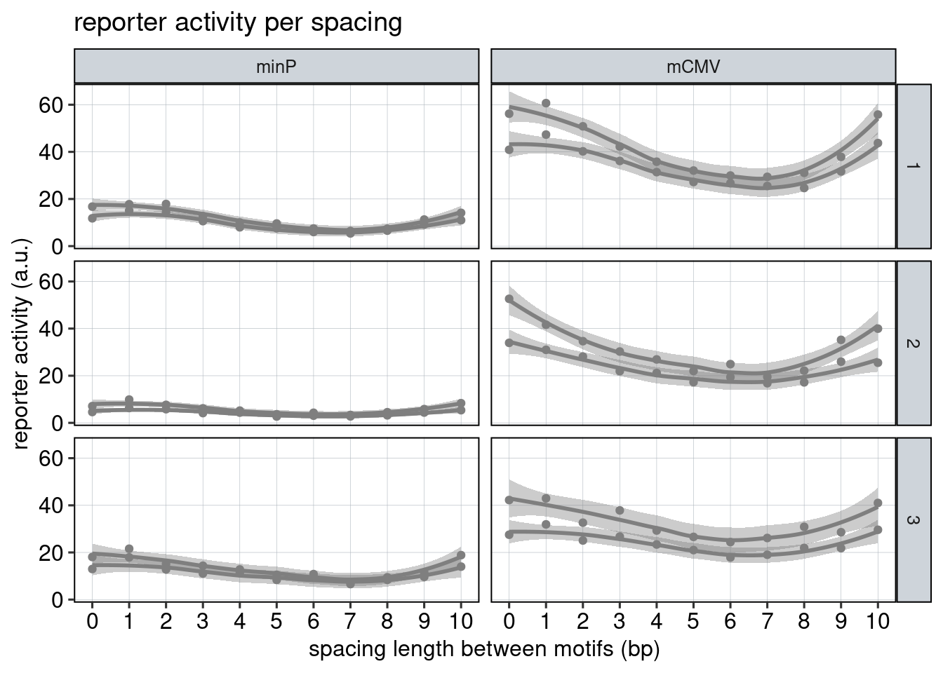 Aim: Show how the spacer length between adjacent binding sites affects reporter activity.
